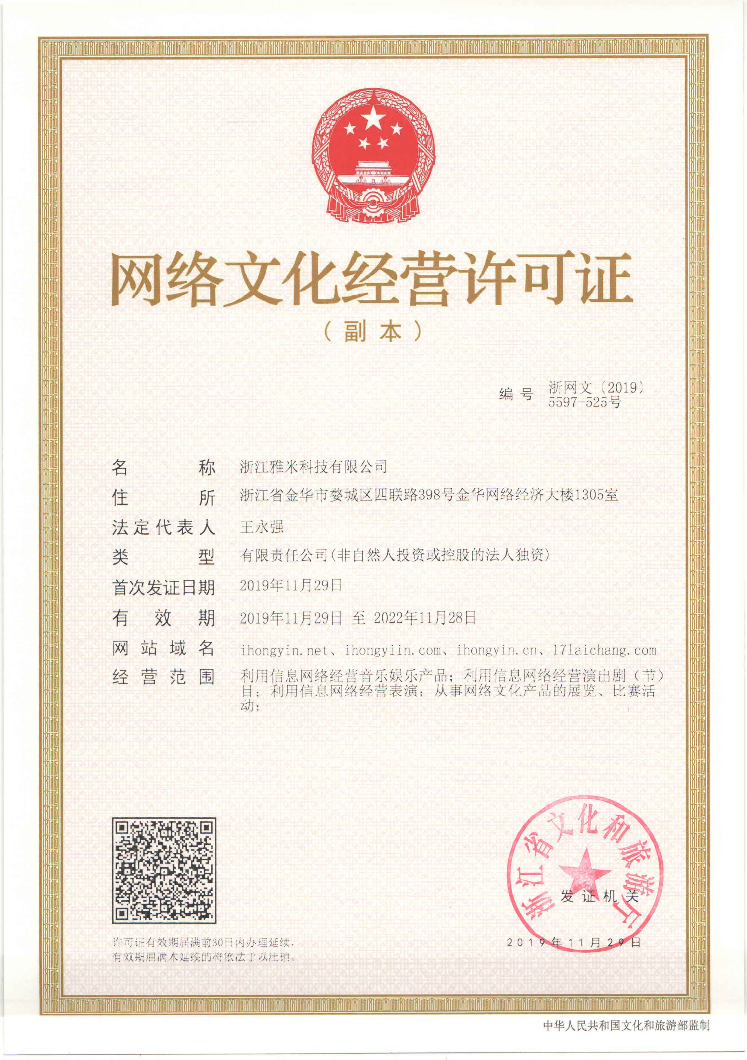 网络文化经营许可证(浙网文(2019)5597-525号)